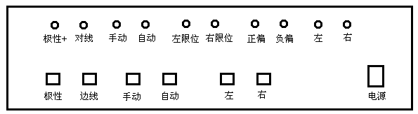 1、指 示 燈: 前面板上部為指示燈,指示當前的工作方式。 2、“極性”按鍵: 設(shè)定電機在自動控制狀態(tài)的旋轉(zhuǎn)方向。 3、“邊線”按鍵: 設(shè)定系統(tǒng)在“對邊”或“對線”方式下工作。 4、“手動”按鍵: 設(shè)定系統(tǒng)在手動控制狀態(tài)下工作。 5、“自動”按鍵: 設(shè)定系統(tǒng)在自動控制狀態(tài)下工作。 6、“左” 按鍵: 在手動狀態(tài)下控制電機的左轉(zhuǎn)。自動狀態(tài)下該鍵無效。 7、“右” 按鍵: 在手動狀態(tài)下控制電機的右動。自動狀態(tài)下該鍵無效。